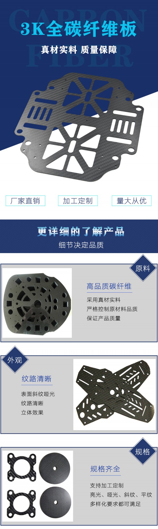 (其他規(guī)格可以定制),除提供正常尺寸的碳纖維板外,我們還可根據(jù)客戶的需求,利用先進的CNC數(shù)控加工中心,對碳纖維板進行切割加工。本廠生產(chǎn)的碳纖維板采用優(yōu)質(zhì)進口的材料壓制而成,紋路清晰,強度高,重量輕!如需其它尺寸,板厚可以定做。性能特點:比強度高、比模量高、質(zhì)輕、耐腐蝕、耐疲勞;熱膨脹系數(shù)小、摩擦系數(shù)低