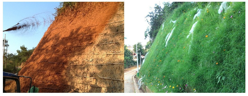 1、防雨水沖刷:可實現坡度90°純巖石坡面噴播作業,發明專利“高分子材料專用噴槍”實現高分子材料與泥漿瞬間均勻結合,噴播基質疏水、保水性好、很好解決了高陡峭純巖石坡面噴播綠化中防雨水沖刷難題。